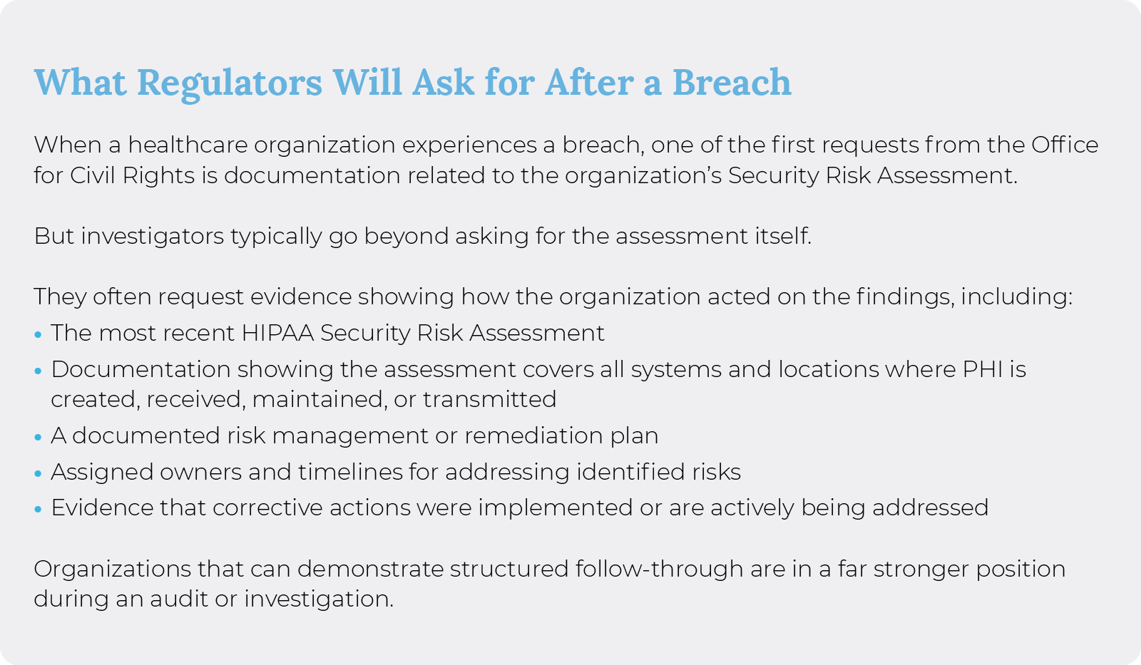 When a healthcare organization experiences a breach, regulators typically begin their investigation with documentation.